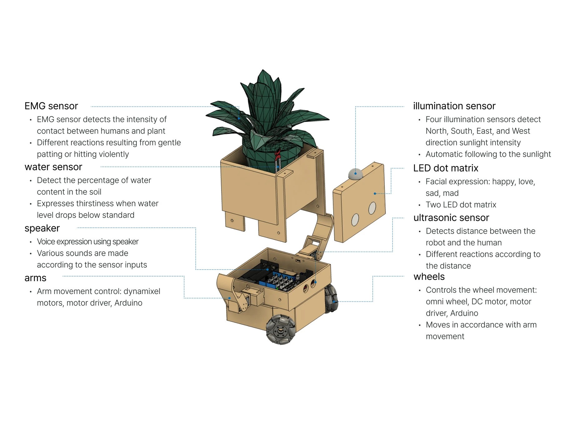 We identified touch and motion as intimate means of communication. Consequently, we developed a plant robot that conveys emotions using robotic arms, wheels, and LED faces and understands the user's context through ultrasonic, EMG, and moisture sensors. It responds to the user's greeting, shows anger if mistreated, appears affectionate when gently patted, and expresses sadness when the plant is too dry. This innovation brings joy to the interaction between humans and plants.